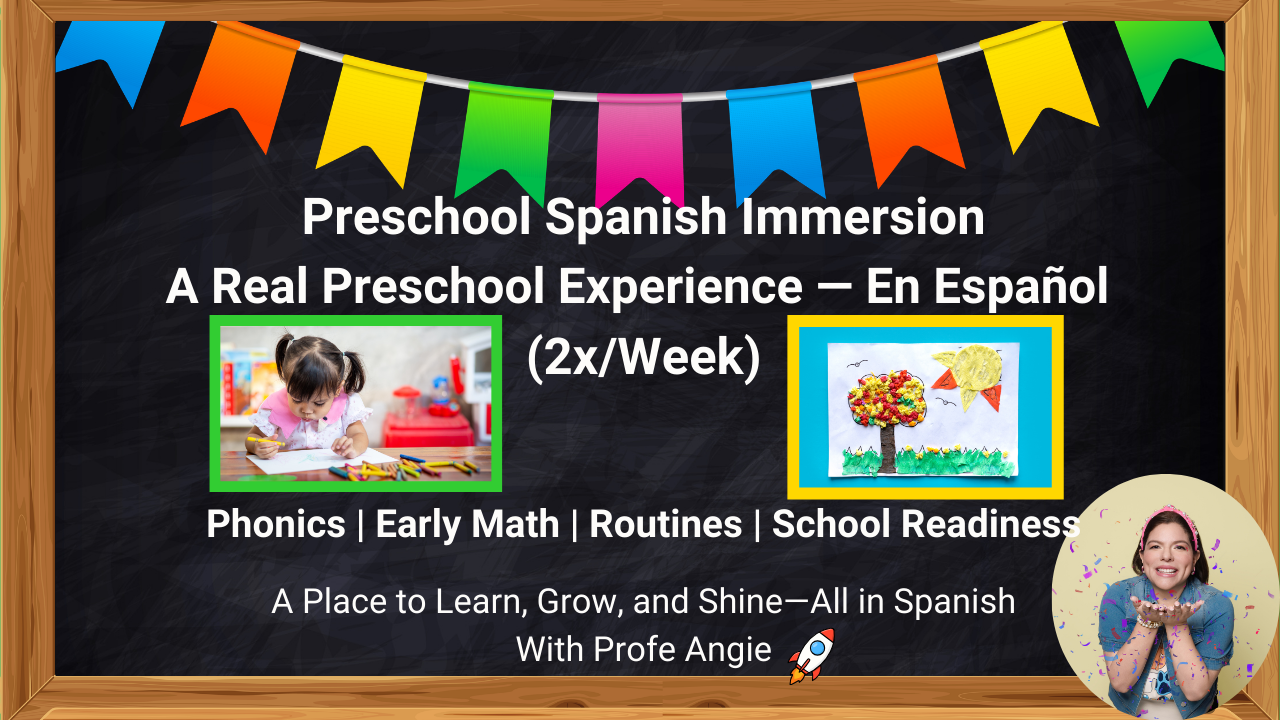 Our Preschool Immersion class feels like a real preschool experience — just in Spanish — where little learners build confidence, vocabulary, and school readiness skills in a nurturing, interactive environment.